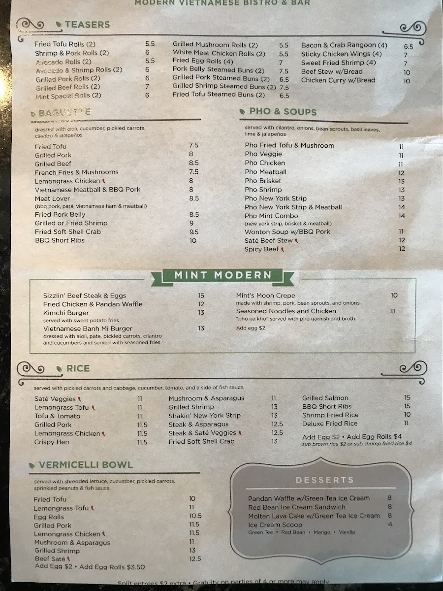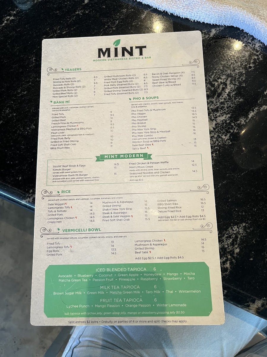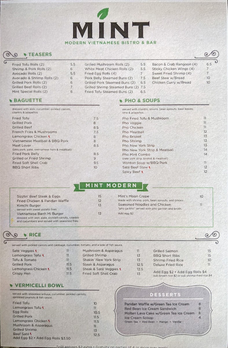 But what truly sets Mint Modern Vietnamese apart is its authenticity and attention to detail. Reviewers consistently rave about the delightful flavors and generous portions of their dishes. Diners have shared experiences like “the pork taco feels like a cloud kiss” and the restaurant delivers on providing not only great food but an exceptional experience with every visit. From friendly bartenders who remember your favorite order to exceptionally clean dining spaces, every aspect of Mint Modern Vietnamese shines with a commitment to quality and service.